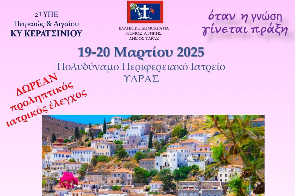 Η δράση θα πραγματοποιηθεί την Τετάρτη 19 Μαρτίου 2025, από τις 18:00 έως τις 21:00, και την Πέμπτη 20 Μαρτίου 2025, από τις 09:00 έως τις 12:30, στο Πολυδύναμο Περιφερειακό Ιατρείο Ύδρας.