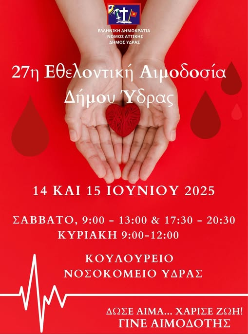 Για μία ακόμη φορά, ο Δήμος Ύδρας αναλαμβάνει δράση και προσκαλεί τους πολίτες να συμμετάσχουν στην εθελοντική αιμοδοσία, μια πράξη αγάπης, ευθύνης και κοινωνικής συνοχής.
