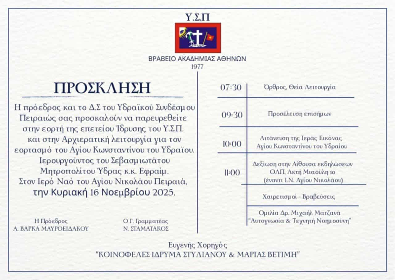 Με ιδιαίτερη τιμή και χαρά, ο Υδραϊκός Σύνδεσμος Πειραιώς ανακοινώνει τον εορτασμό της επετείου ίδρυσής του και τη λαμπρή πανήγυρη του Αγίου Κωνσταντίνου του Υδραίου.