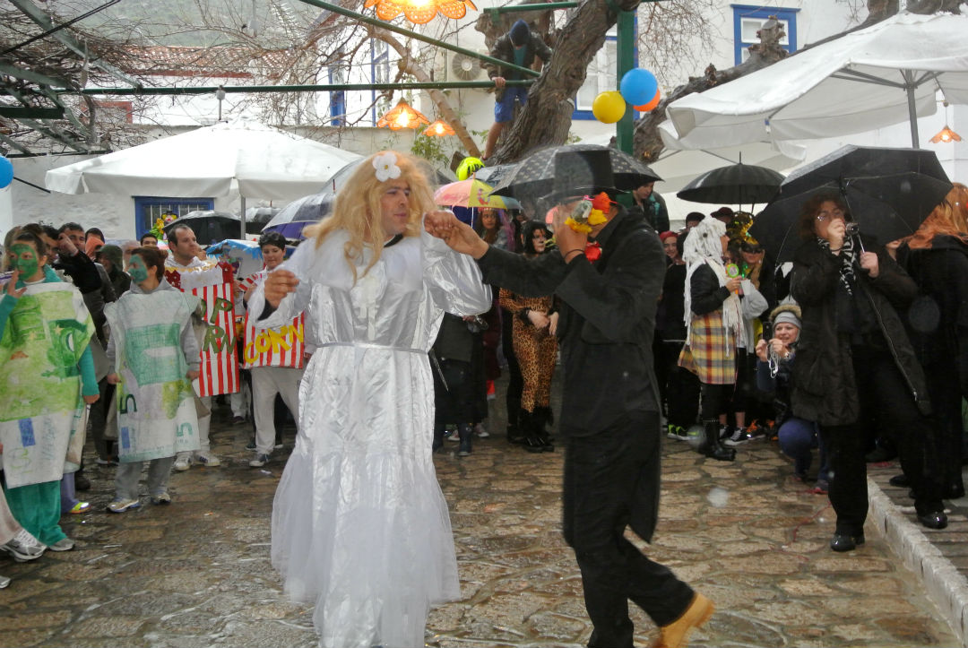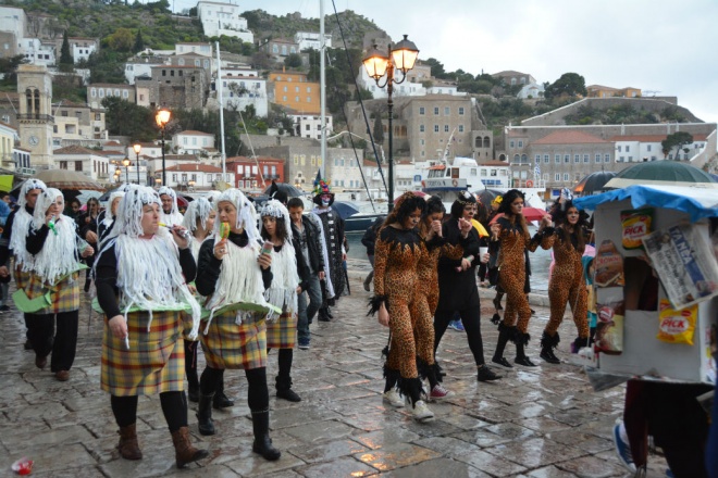 Τίποτα δεν ήταν αρκετό για να πτοήσει το φετινό καρναβάλι της Ύδρας! Η νεροποντή που ξεκίνησε από τα πρώτα "βήματα" του καρναβαλιού δε στάθηκε εμπόδιο για τους χαρούμενους καρναβαλιστές που συνέχισαν την περιοδεία τους από τα στενά σοκάκια του νησιού μας, κάνοντας στάσεις γλεντιού. Και με πορεία προς τη συνήθη διαδρομή, μέχρι και την παραλία, όπου στήθηκε ξέφρενος χορός, συνοδευόμενος από ένα υπέροχο γαϊτανάκι. Τι κι αν η βροχή συνέχισε να πέφτει σαν άφθονος "χαρτοπόλεμος" πάνω στις πολύχρωμες ομπρέλες. Το καρναβάλι γεμάτο ευφάνταστες στολές, ιδιαίτερες μεταμφιέσεις, θεματικά group, γελαστά πρόσωπα και ντυσίματα με υπονοούμενα ήταν συνέχεια ενεργό. Ο Καρνάβαλος με τον γαμπρό και τη νύφη, και όλους τους μασκαράδες χάρισαν διασκέδαση, χρωματίζοντας τη διάθεση μικρών και μεγάλων. Μετά το καρναβάλι έφτασε στην Ξερή Ελιά όπου τα τραπέζια περίμεναν τον κόσμο γεμάτα κρασί και πολλά εδέσματα, ενώ πάνω από αυτά υπήρχαν τέντες για προφύλαξη από τη συνεχή βροχή. Εκεί μετά το καλωσόρισμα του Δημάρχου Γιώργου Κουκουδάκη και τις ευχές του, ξεκίνησε ένα πολύωρο γλέντι, όπου ο Γιάννης Κονιτόπουλος ξεσήκωσε όλους τους παρευρισκόμενους με τα νησιώτικα τραγούδια του και το υπέροχο ρεπερτόριό του. Και του χρόνου ευχόμαστε και πολλά συγχαρητήρια στην επιτροπή καρναβαλιού και τον Δήμο, αλλά και σε όσους πρόθυμα και αυθόρμητα πρόσφεραν χρώμα, ενθουσιασμό και πολύ κέφι!