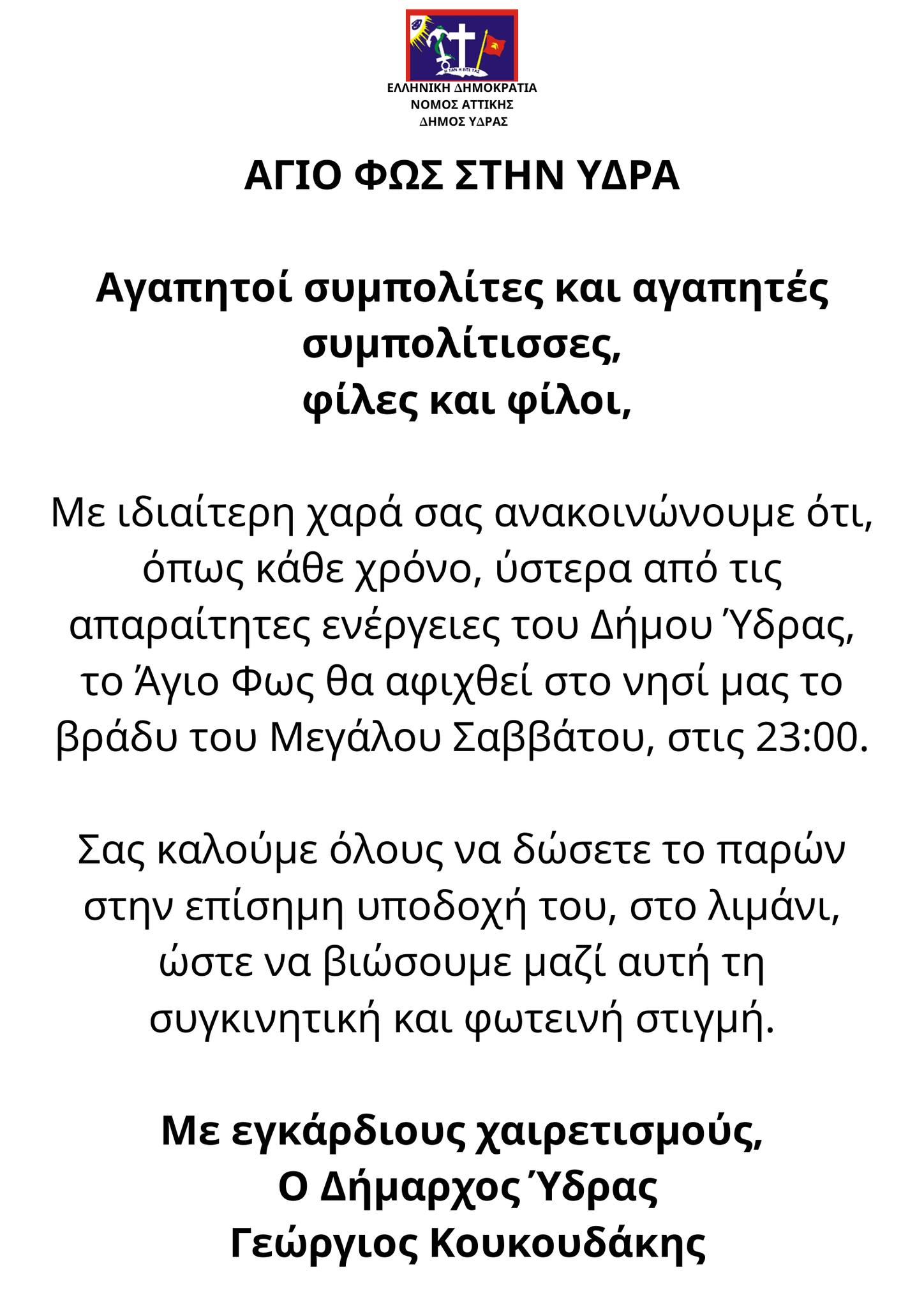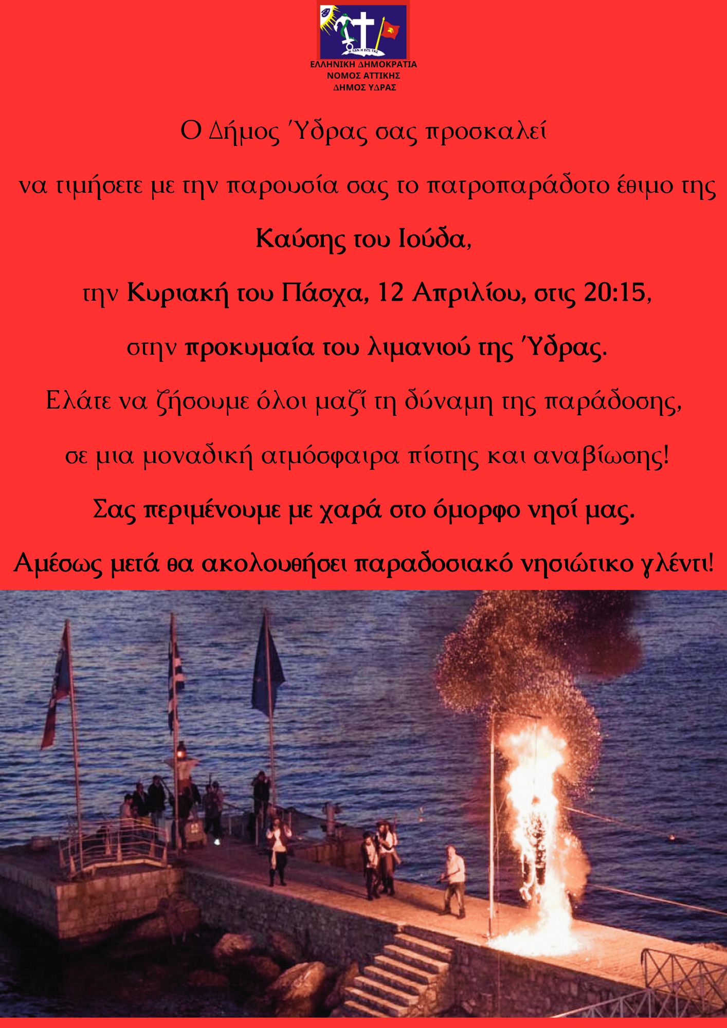 Ο Δήμος Ύδρας σας προσκαλεί να τιμήσουμε και φέτος το Άγιο Πάσχα με σεβασμό στην παράδοση και πνεύμα κατάνυξης, μέσα από εκδηλώσεις που αποτελούν αναπόσπαστο κομμάτι της ταυτότητας του νησιού μας.