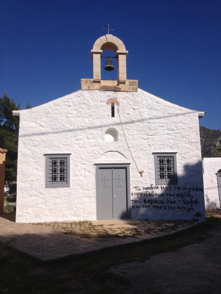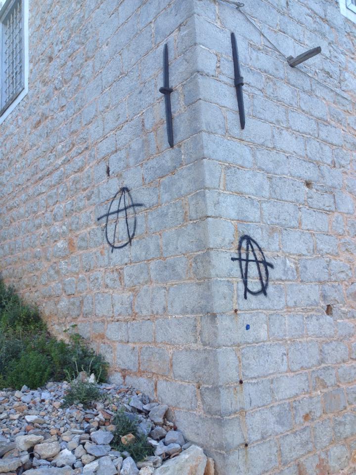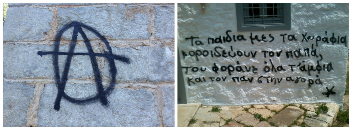 Με σύνθημα τους στίχους από το τραγούδι του Μάνου Χατζηδάκι αλλά και με γνωστό σύμβολο, βεβήλωσαν άγνωστοι αυτές τις μέρες τον τοίχο στο εκκλησάκι του Άη Γιώργη δίπλα στην παλιά Heaven και τον τοίχο του αρχοντικού του Παύλου Κουντουριώτη στην Ύδρα.