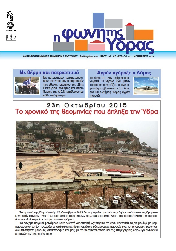 Κυκλοφόρησε το τεύχος Νοεμβρίου 2015 της «Φωνής της Ύδρας» με πλούσια ενημερωτική ύλη, άρθρα, ενδιαφέρουσες απόψεις, σχολιασμούς, επισημάνσεις. Διαβάστε μεταξύ άλλων: 23η Οκτωβρίου 2015 - Το χρονικό της θεομηνίας που έπληξε την Ύδρα, (ρεπορτάζ και φωτογραφίες), ΑΠΟΚΛΕΙΣΤΙΚΟ ΡΕΠΟΡΤΑΖ - Προχωράνε τα έργα στο Σαν Τζόρτζι..., τα γεφύρια και ο αντιπλημμυρικός ρόλος τους, ο εορτασμός της 28ης Οκτωβρίου στο νησί μας, βήμα πολιτών και πολλά άλλα θέματα.