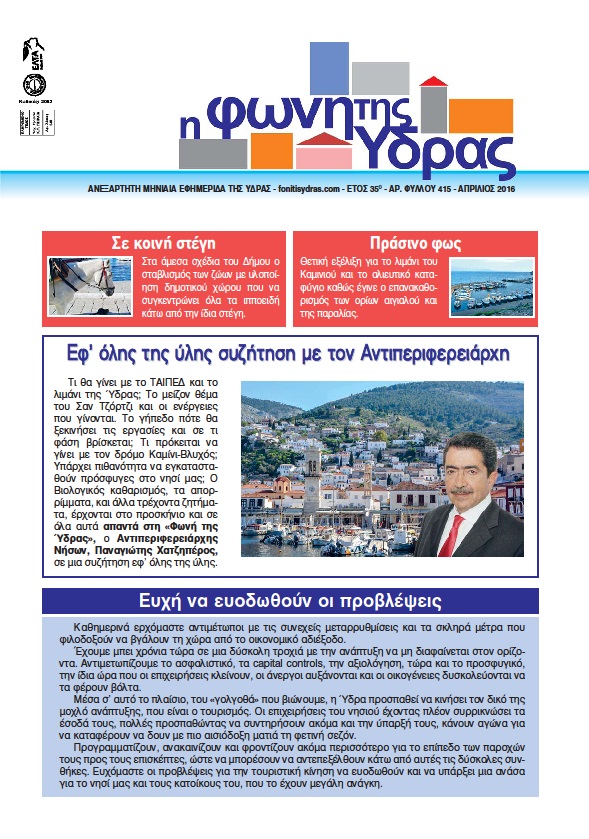 Kυκλοφόρησε το τεύχος Απριλίου της «Φωνής της Ύδρας» με πλούσια ενημερωτική ύλη, άρθρα, σχολιασμούς, προτάσεις και επισημάνσεις. Διαβάστε μεταξύ άλλων: Εφ’ όλης της ύλης συζήτηση με τον Αντιπεριφερειάρχη Νήσων Παναγιώτη Χατζηπέρο (Τι θα γίνει με το ΤΑΙΠΕΔ και το λιμάνι της Ύδρας; Το γήπεδο πότε θα ξεκινήσει τις εργασίες και σε τι φάση βρίσκεται; Τι πρόκειται να γίνει με τον δρόμο Καμίνι-Βλυχός; Υπάρχει πιθανότητα να εγκατασταθούν πρόσφυγες στο νησί μας; Ο Βιολογικός καθαρισμός, τα απορρίμματα, και άλλα τρέχοντα ζητήματα, έρχονται στο προσκήνιο). Πράσινο φως για το λιμάνι στο Καμίνι, Σταβλισμός των ιπποειδών και επιμέρους ζητήματα, Εξελίξεις και παρεμβάσεις για το Σαν Τζόρτζι, πολιτιστικά, ιστορικά, το περισκόπιο του μήνα και όλα τα νέα, αποκλειστικά για το νησί μας, συνοπτικά, αντικειμενικά και εμπεριστατωμένα.