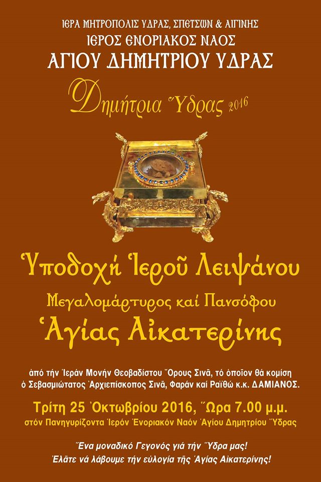 Το Ιερό Λείψανο της Αγίας Αικατερίνης, το οποίο θα φέρει στην Ύδρα ο Αρχιεπίσκοπος Σινά κ. Δαμιανός, θα υποδεχτεί ο Ιερός Ναός Αγίου Δημητρίου Ύδρας την Τρίτη 25 Οκτωβρίου 2016 και ώρα 19:00. Θα ακολουθήσει Μέγας Αρχιερατικός Εσπερινός και λιτάνευση της ιερής εικόνας και του τιμίου λειψάνου της Αγίας Αικατερίνης προς το λιμάνι, επιστροφή και απόλυση.