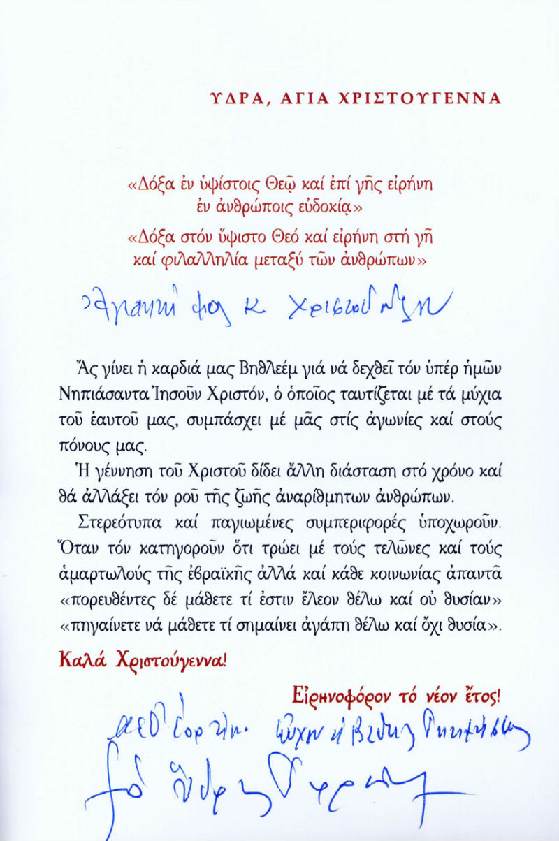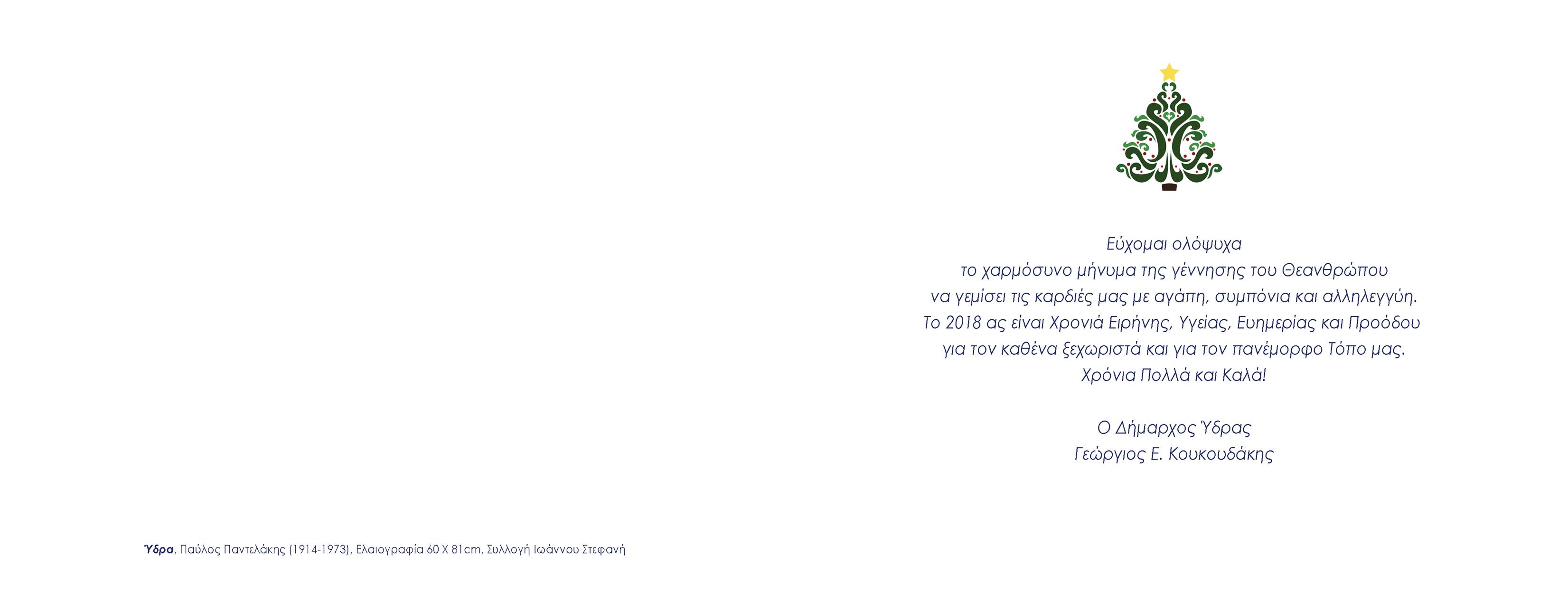 Από την όμορφη και ιστορική Ύδρα εύχομαι σε όλους και όλες μια Καλή και Ευλογημένη Χρονιά. Το 2018 ας είναι Χρονιά Ειρήνης, Υγείας, Ευημερίας και Προόδου για τον καθένα ξεχωριστά και για τον πανέμορφο Τόπο μας.
