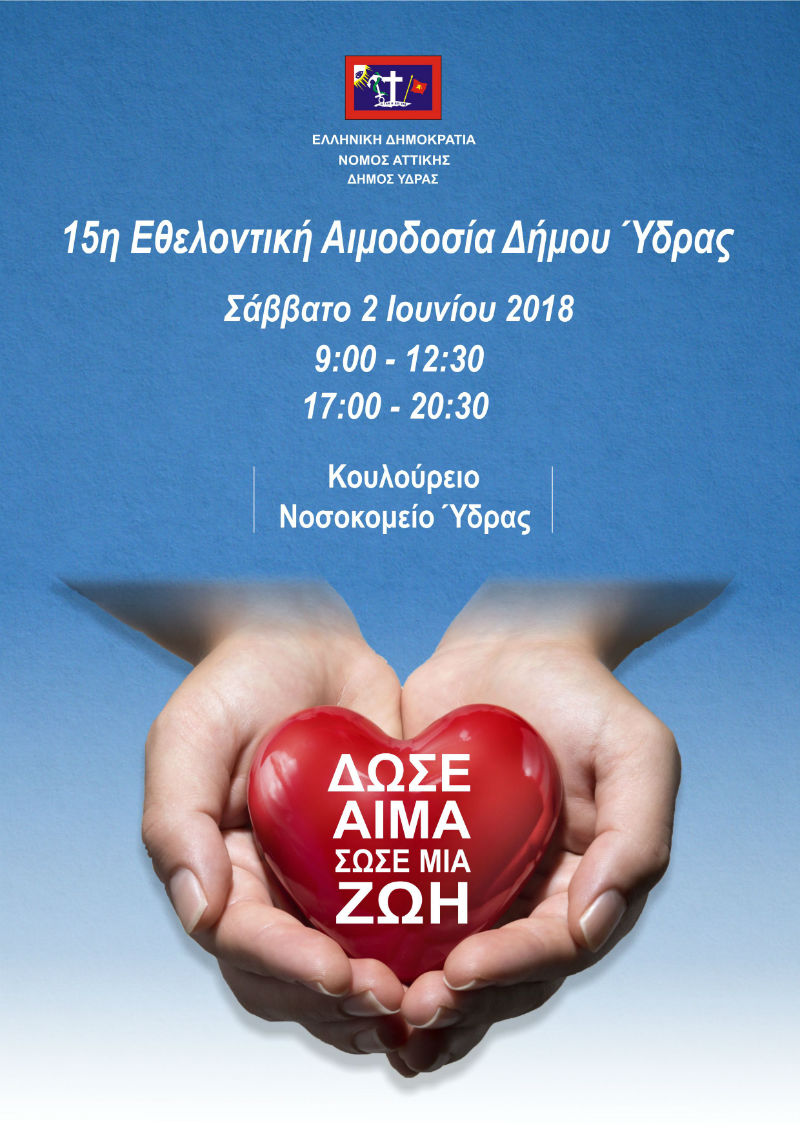 O Δήμος Ύδρας» μας καλεί να δώσουμε το «παρών» στην 15η Εθελοντική Αιμοδοσία, το Σάββατο 2 Ιουνίου 2018 από τις 9.00-12.30 και από τις 17.00-20.30, στην ειδικά διαμορφωμένη αίθουσα του Κουλούρειου Νοσοκομείου «Παναγία Φανερωμένη» σε συνεργασία με το Γενικό Κρατικό Νοσοκομείο Νικαίας.