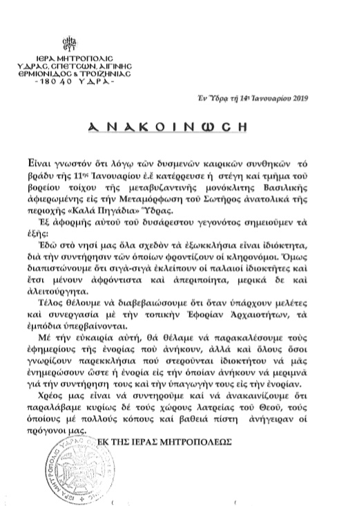 Μετά την κατάρρευση τμήματος του ναού της Μεταμόρφωσης του Σωτήρος λόγω δυσμενών καιρικών συνθηκών, εκκλησίας που βρίσκεται ανατολικά της περιοχής "Καλά Πηγάδια" η Ι. Μητρόπολη Ύδρας, Σπετσών και Αιγίνης, εξέδωσε σχετική ανακοίνωση.