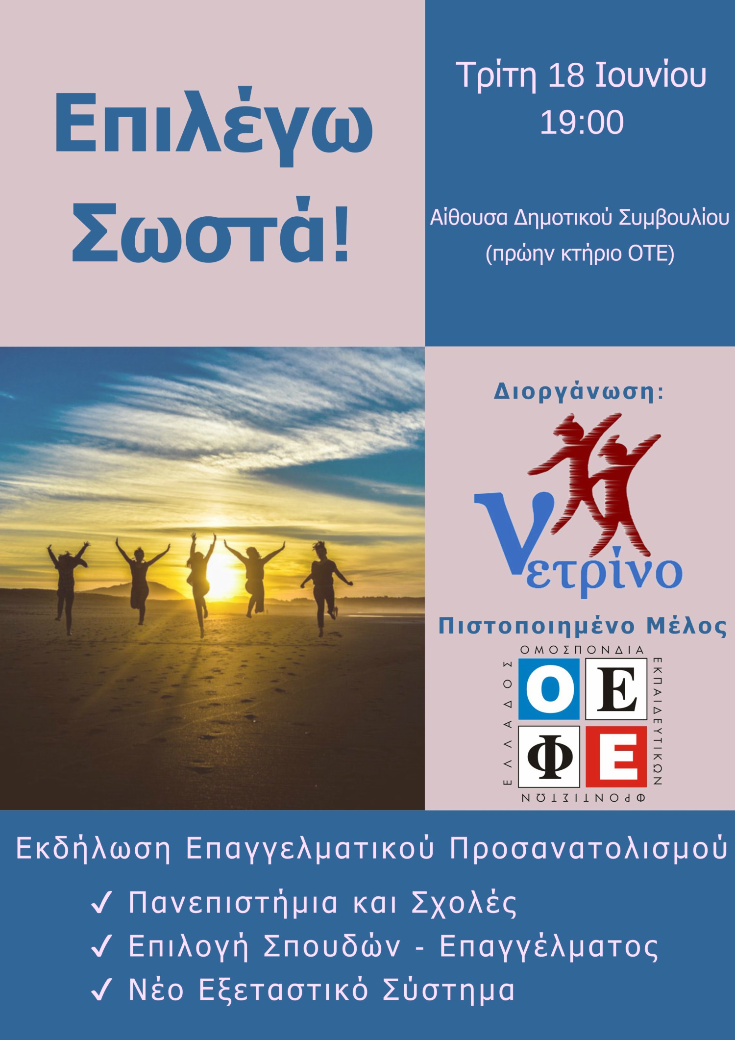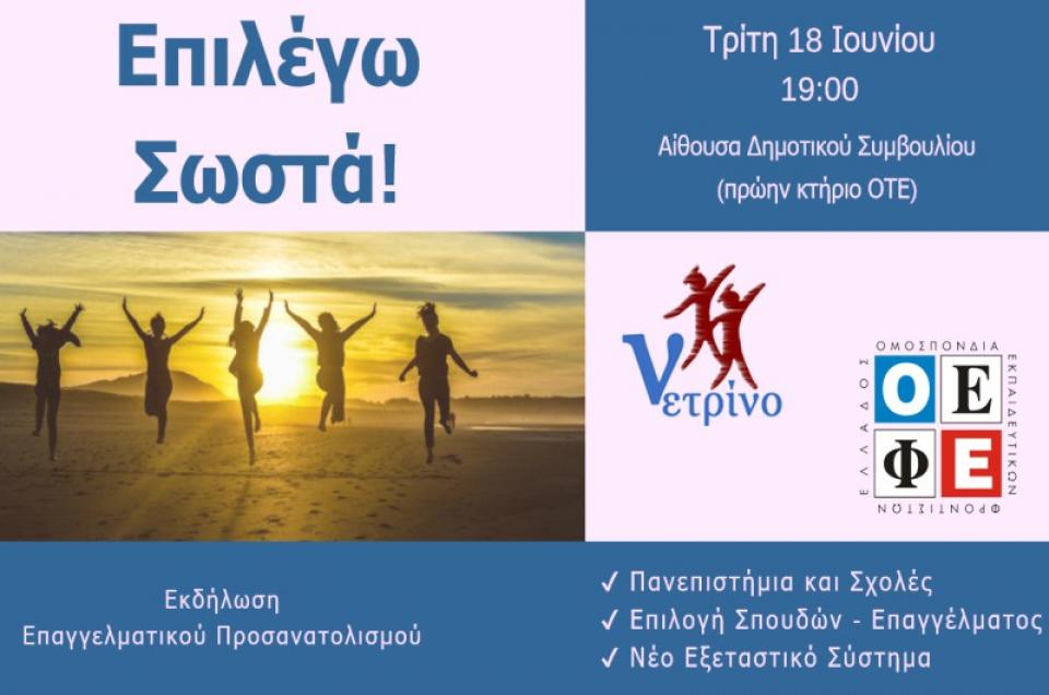 Eκδήλωση Επαγγελματικού Προσανατολισμού θα πραγματοποιήσει το Φροντιστήριo Νετρίνο την Τρίτη 18 Ιουνίου στις 19:00, στην Αίθουσα του Δημοτικού Συμβουλίου (πρώην κτήριο ΟΤΕ).