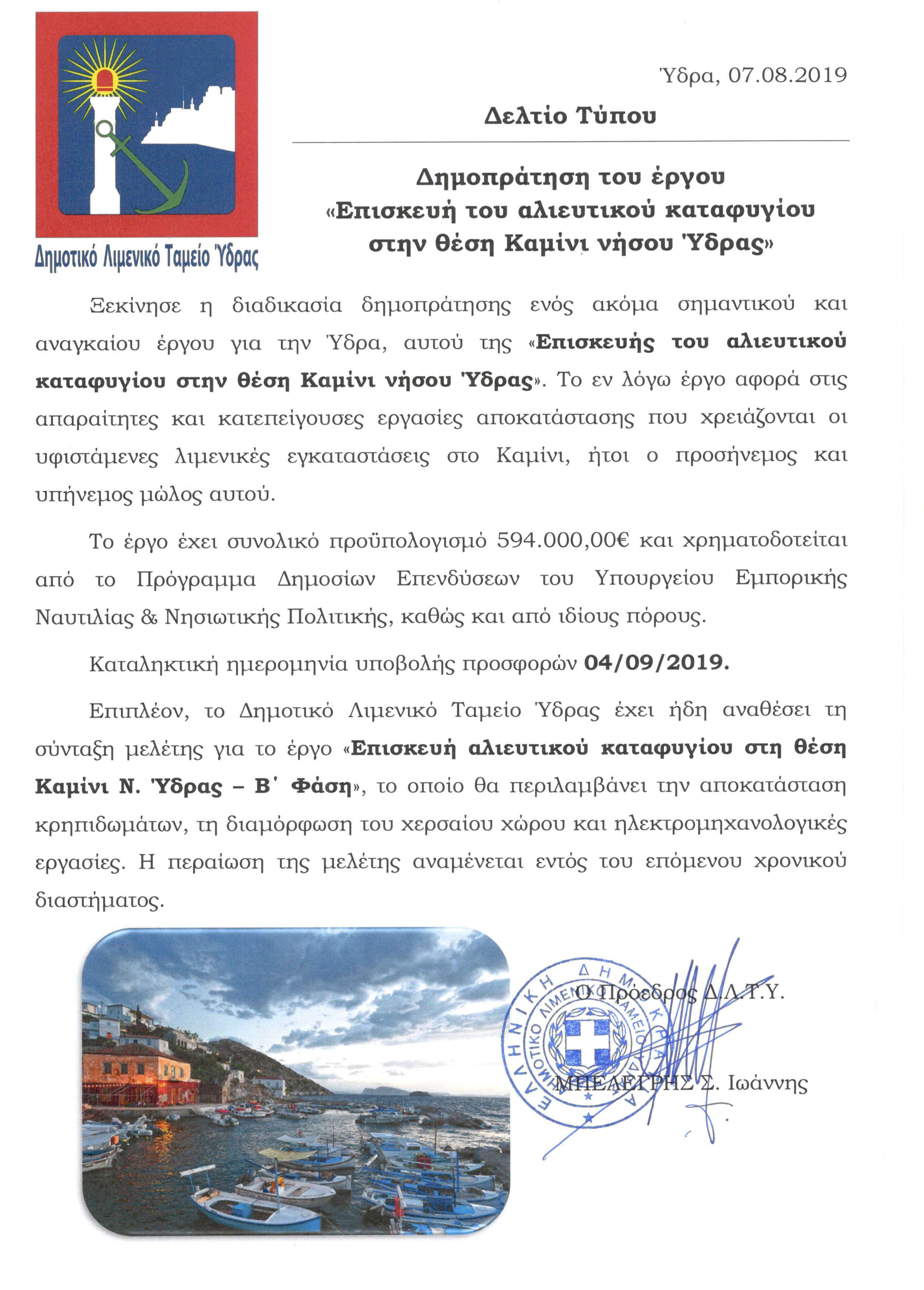 Επιπλέον, το Δημοτικό Λιμενικό Ταμείο Ύδρας έχει ήδη αναθέσει τη σύνταξη μελέτης για το έργο «Επισκευή αλιευτικού καταφυγίου στη θέση Καμίνι Ν. Ύδρας – Β΄ Φάση», το οποίο θα περιλαμβάνει την αποκατάσταση κρηπιδωμάτων, τη διαμόρφωση του χερσαίου χώρου και ηλεκτρομηχανολογικές εργασίες.