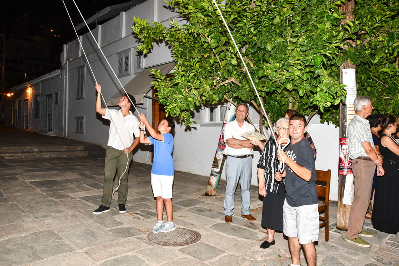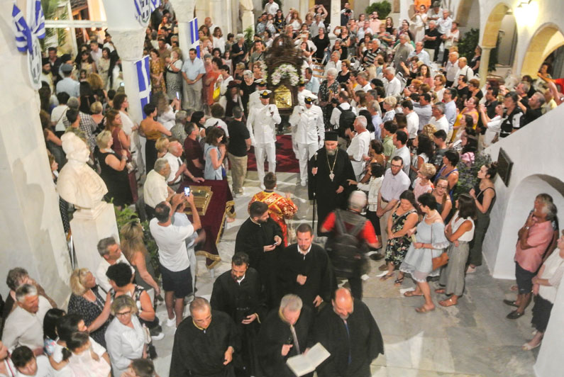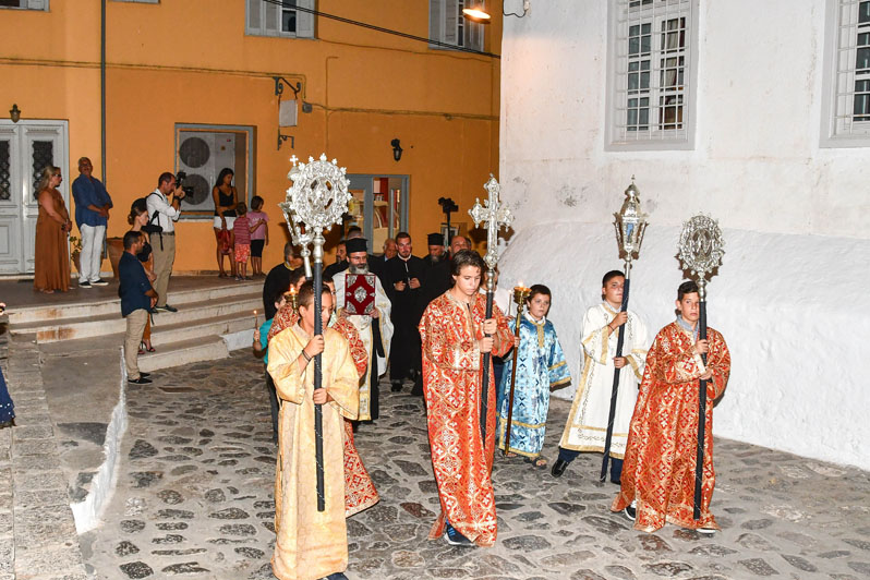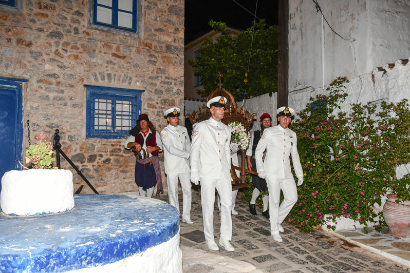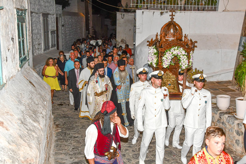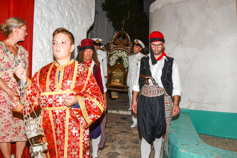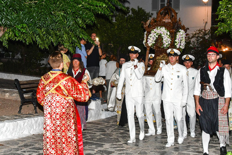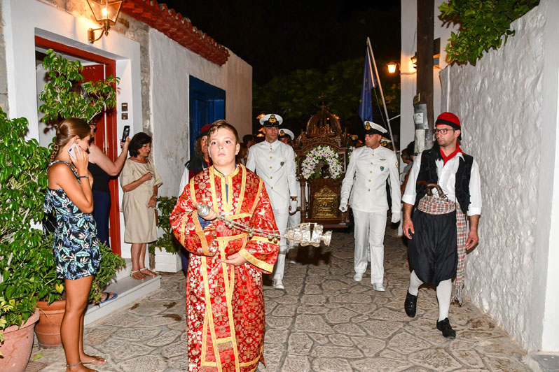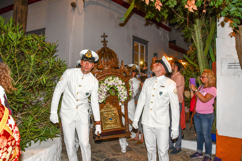 Οι περισσότεροι από τους πιστούς ακολούθησαν την καθιερωμένη λιτάνευση της Ιερής Εικόνας που την κρατούσαν άνδρες του Λιμενικού Σώματος πλαισιωμένοι από μπουρλοτιέρηδες.