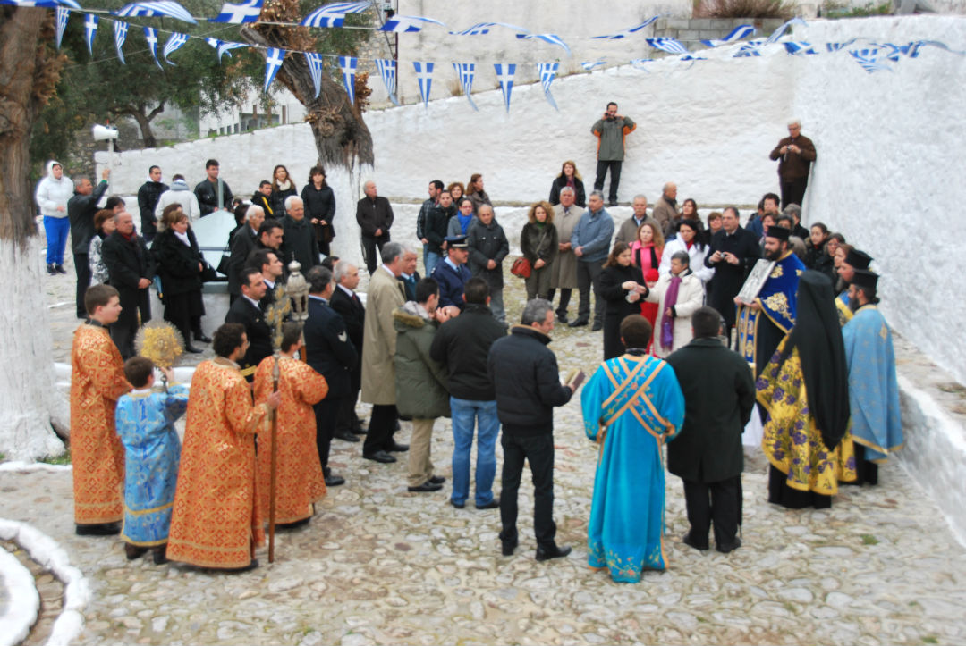 Mε λαμπρότητα γιορτάστηκαν και φέτος τα Θεοφάνεια στο νησί μας με τη συμμετοχή του ιερού κλήρου. Το τσουχτερό κρύο και ο δυνατός αέρας δεν εμπόδισαν πλήθος κόσμου, το οποίο ακολούθησε την πομπή προς τα Καλά Πηγάδια για τον αγιασμό των υδάτων αλλά και παρακολούθησε την κατάδυση του τιμίου σταυρού στη θάλασσα στο λιμενοβραχίονα. Με δύναμη και ενθουσιασμό οι θαρραλέοι νέοι του νησιού μας έπεσαν να "πιάσουν" το σταυρό. Ο επιστήθιος σταυρός που δόθηκε στον άξιο νέο Μιχάλη Αναργύρου είναι χορηγία του Κοινωφελούς Ιδρύματος Ύδρας Στυλιανού και Μαρίας Βέτιμη.