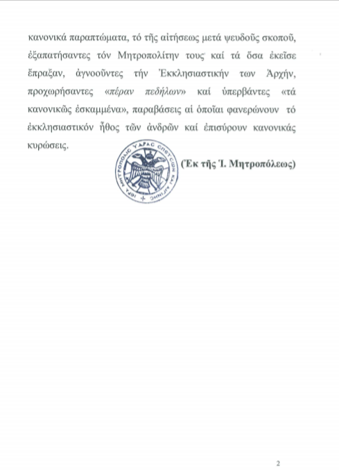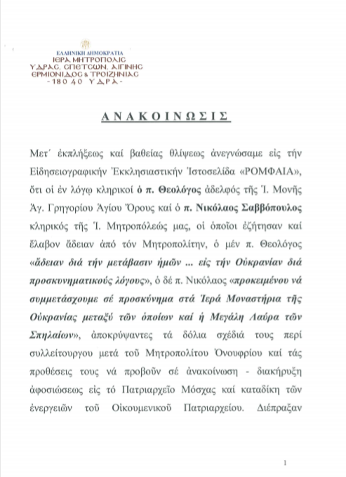 Όπως τονίζεται όμως στην ανακοίνωση οι δυο κληρικοί συλλειτούργησαν με τον Μητροπολίτη Ονούφριο και προέβησαν σε ανακοίνωση-διακήρυξη αφοσιώσεως στο Πατριαρχείο της Μόσχας και καταδίκη των ενεργειών του Οικουμενικού Πατριαρχείου.