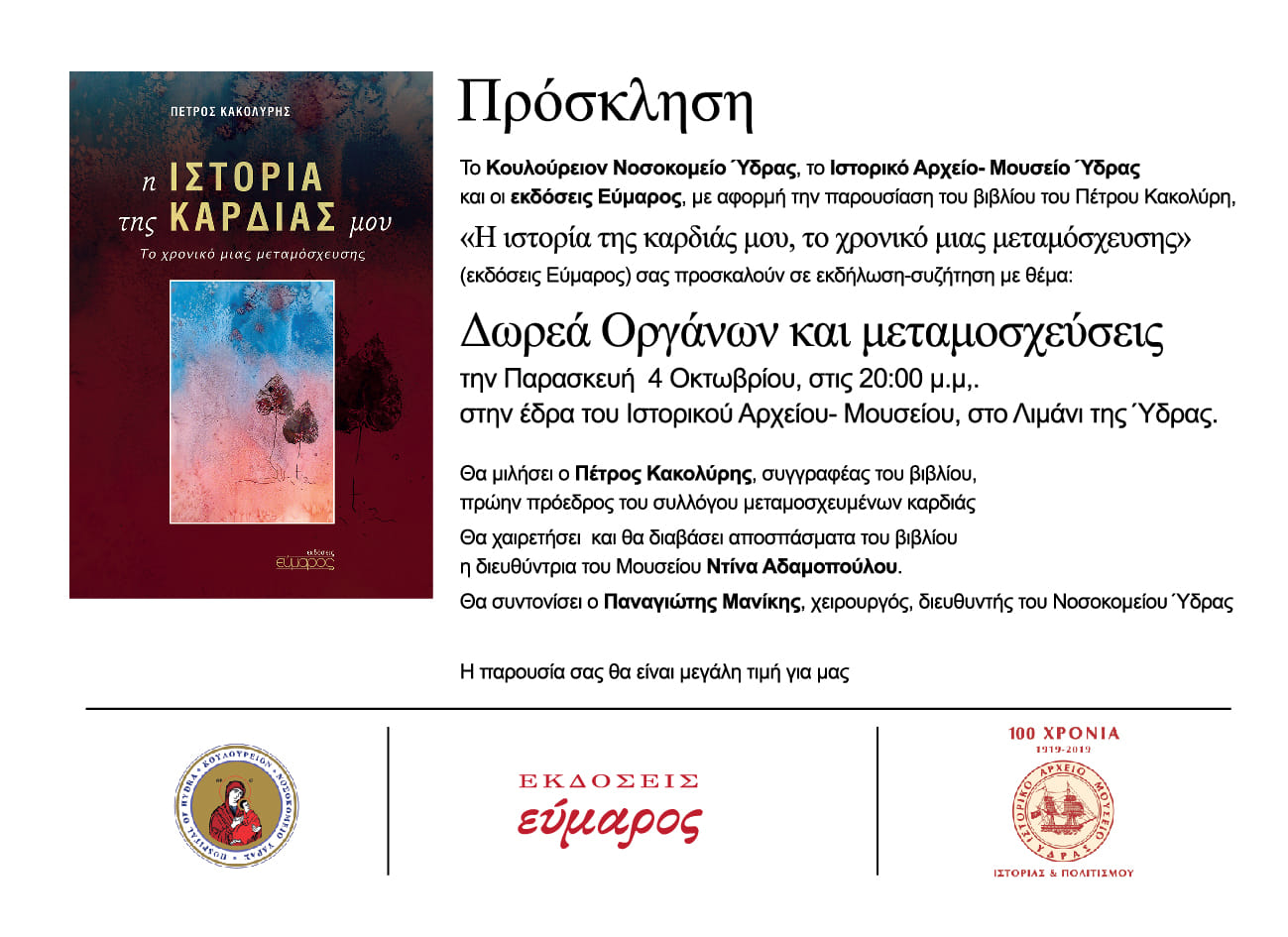 Tο Κουλούρειο Νοσοκομείο Ύδρας, το Ιστορικό Αρχείο - Μουσείο Ύδρας και oι εκδόσεις "Εύμαρος" με αφορμή την παρουσίαση του βιβλίου του Πέτρου Κακολύρη "Η ιστορία της καρδιάς μου, το χρονικό μιας μεταμόσχευσης" διοργανώνουν εκδήλωση - συζήτηση με θέμα: Δωρεά Οργάνων και μεταμοσχεύσεις.