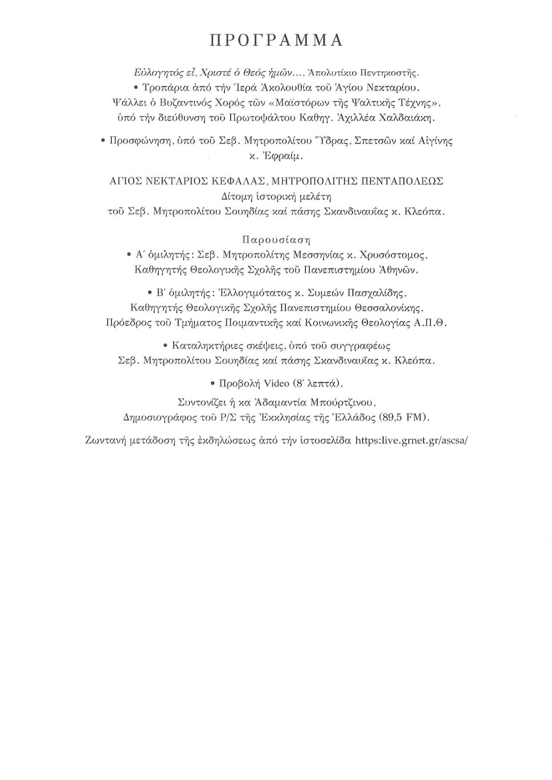 Η Αποστολική Διακονία της Εκκλησίας της Ελλάδος και η Ιερά Μητρόπολη Ύδρας, Σπετσών και Αιγίνης προσκαλούν στην εκδήλωση παρουσίασης της Δίτομης ιστορικής μελέτης επί τη βάσει ανέκδοτων αρχειακών πηγών (στην ελληνική και την αγγλική) “ Ἅγιος Νεκτάριος Κεφαλάς, Μητροπολίτης Πενταπόλεως ” του Σεβ. Μητροπολίτου Σουηδίας και πάσης Σκανδιναυΐας κ. Κλεόπα, εκδόσεων της Αποστολικής Διακονίας, που θα πραγματοποιηθεί την Τετάρτη 6 Νοεμβρίου 2019, ώρα 18.00, στο Αμφιθέατρο Cotsen Hall της Αμερικανικής Σχολής Κλασσικών Σπουδών (στον χώρο της Γενναδείου Βιβλιοθήκης, είσοδος από την οδό Αναπήρων Πολέμου, αρ. 9).