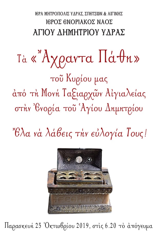 Η Ιερά Μητρόπολις Ύδρας, Σπετσών & Αιγίνης, και συγκεκριμένα ο Ενοριακός Ναός Αγίου Δημητρίου Ύδρας θα υποδεχθούν τα "Άχραντα Πάθη" του Κυρίου μας από την ιερά μονή Παμμεγίστων Ταξιαρχών Αιγιαλείας όπου και φυλάσσονται.