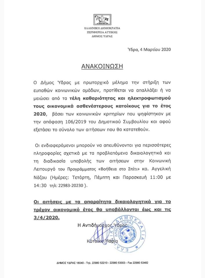 Αναλυτικότερα η ανακοίνωση του Δήμου Ύδρας: