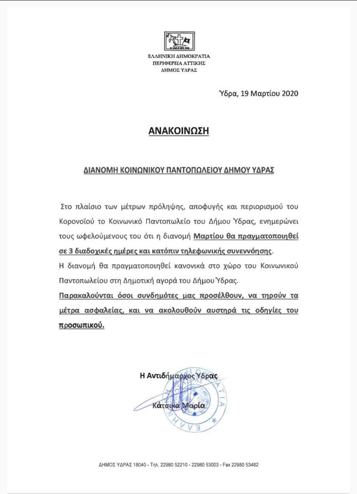 Πιο συγκεκριμένα όπως ενημερώνει με ανακοίνωση του Δ. Ύδρας, η Αντιδήμαρχος Μαίρη Κάτσικα η διανομή θα πραγματοποιηθεί σε 3 διαδοχικές ημέρες.