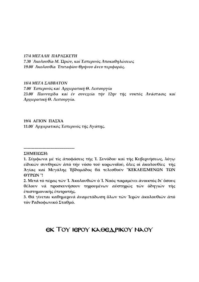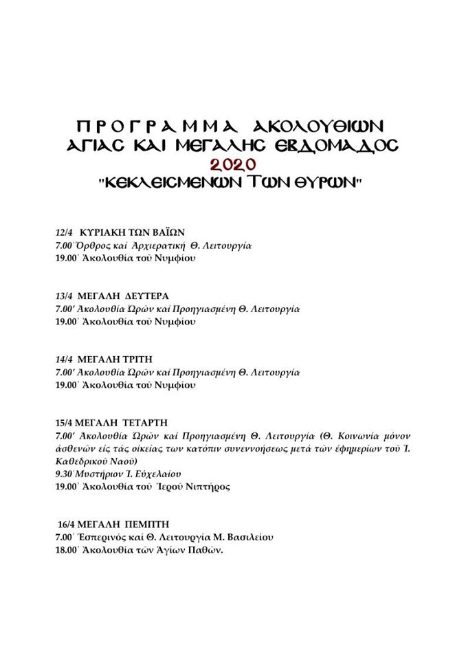 Το πρόγραμμα των ακολουθιών της Αγίας και Μ. Εβδομάδος του Ι. Καθεδρικού Ναού Ύδρας "κεκλεισμένων των θυρών"