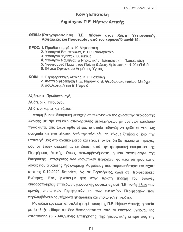 Κοινή επιστολή, έστειλαν οι Δήμαρχοι της Περιφερειακής Ενότητας Νήσων Αττικής, οι οποίοι εκφράζουν τους προβληματισμούς τους για την κατηγοριοποίηση της Π.Ε. Νήσων στον Χάρτη Υγειονομικής Ασφάλειας και Προστασίας από τον κορωνοϊό covid-19.