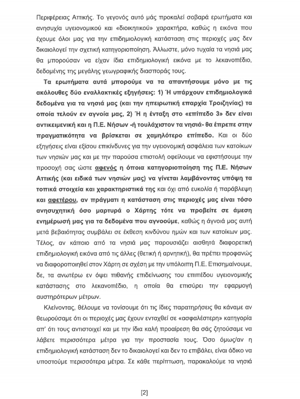 Με την επιστολή τους οι Δήμαρχοι των νησιών της Αττικής, ζητούν να πληροφορηθούν για ποιο λόγο δεν διαφοροποιείται η Π.Ε. Νήσων Αττικής από το επίπεδο υγειονομικής κατάστασης (3 - Αυξημένης Επιτήρησης) της ηπειρωτικής επικράτειας της Περιφέρειας Αττικής, καθώς τα τοπικά στοιχεία και η επιδημιολογική κατάσταση των περιοχών τους δεν δικαιολογεί αυτή την κατηγοριοποίηση. Σε περίπτωση δε, επιδείνωσης του επιπέδου υγειονομικής κατάστασης στο λεκανοπέδιο, οι δήμαρχοι εκφράζουν την ανησυχία τους ότι κάτι τέτοιο θα επιφέρει αυστηρότερα μέτρα στις περιοχές τους.