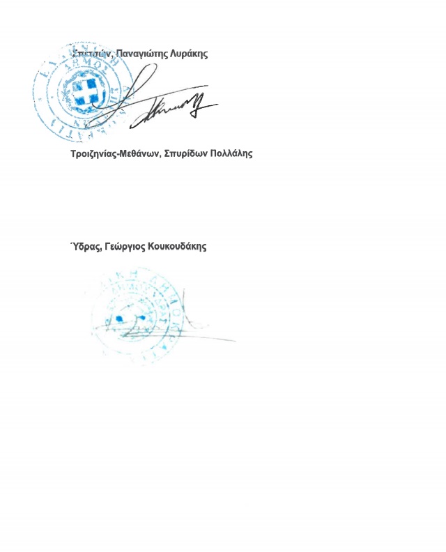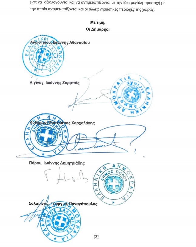 Την επιστολή υπογράφουν οι Δήμαρχοι: Αγκιστρίου Ιωάννης Αθανασίου, Αίγινας Ιωάννης Ζορμπάς, Κυθήρων Ευστράτιος Χαρχαλάκης, Πόρου Ιωάννης Δημητριάδης, Σαλαμίνας Γεώργιος Παναγόπουλος, Σπετσών Παναγιώτης Λυράκης και Ύδρας Γιώργος Κουκουδάκης.