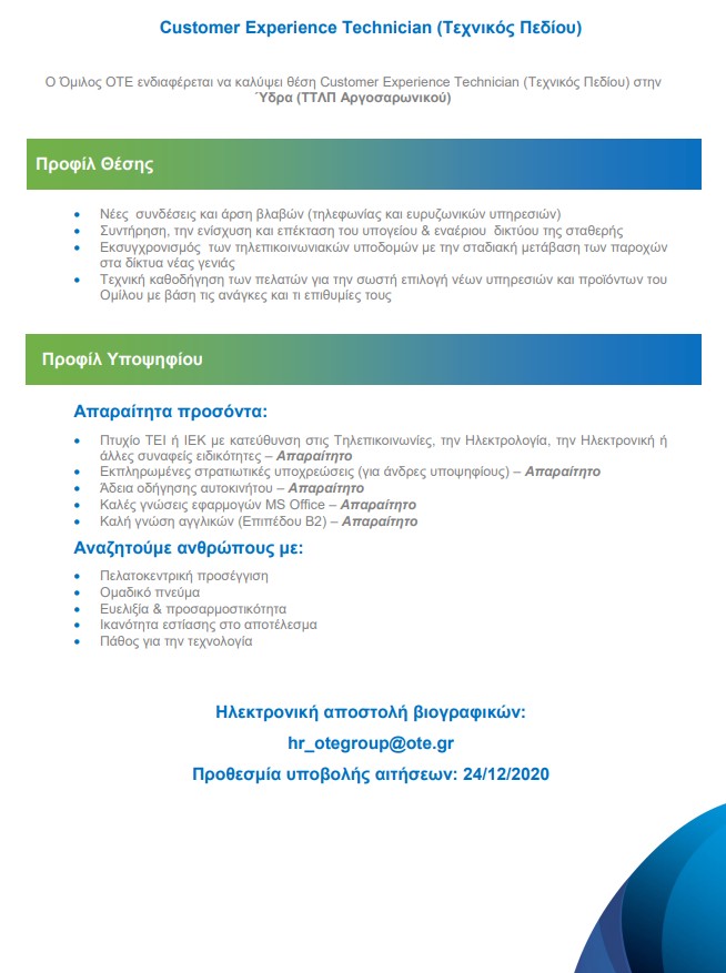 Ο Όμιλος ΟΤΕ ενδιαφέρεται να καλύψει θέση Customer Experience Technician (Τεχνικός Πεδίου) στην Ύδρα (ΤΤΛΠ Αργοσαρωνικού)
