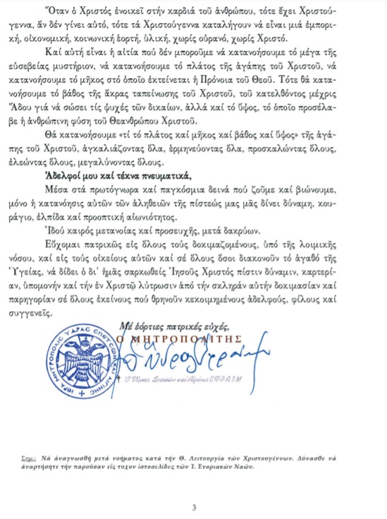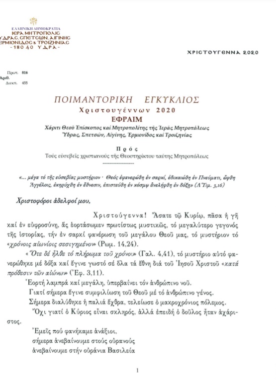 Ο Σεβασμιότατος Μητροπολίτης Ύδρας, Σπετσών, Αιγίνης κ.κ. ΕΦΡΑΙΜ εξέδωσε Ποιμαντορική Εγκύκλιο Χριστουγέννων προς όλους τους συμπολίτες μας. Αναφέρει μεταξύ άλλων ο Ποιμενάρχης μας: "Με την πίστη έρχεται και κατοικεί ο Χριστός στην καρδιά μας. Με την παρουσία του Χριστού έρχεται η παρουσία της αγάπης και με την αγάπη έρχεται όλη η αγαθοσύνη και η ευσπλαχνία."