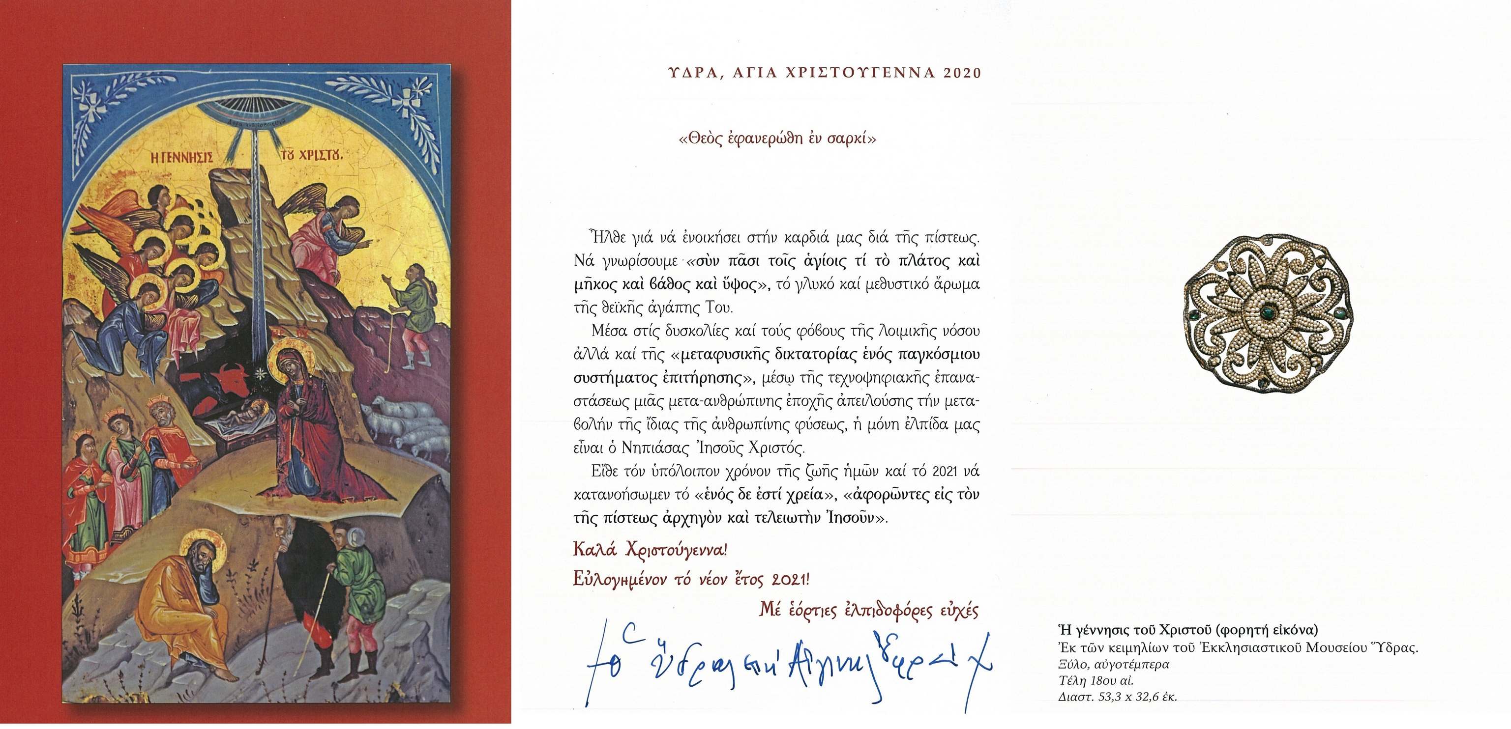 Με την παρακάτω κάρτα εκφράζει προς όλους τις εόρτιες ευχές του, ο Σεβασμιώτατος Μητροπολίτης Ύδρας, Σπετσών & Αιγίνης κ.κ. ΕΦΡΑΙΜ