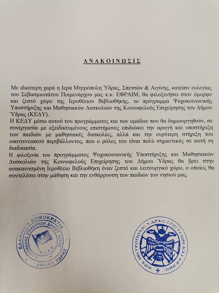 Με ιδιαίτερη χαρά η Ιερά Μητρόπολη Ύδρας, Σπετσών & Αιγίνης, κατόπιν ευλογίας του Σεβασμιωτάτου Ποιμενάρχου μας κ.κ. ΕΦΡΑΙΜ, θα φιλοξενήσει στον όμορφο και ζεστό χώρο της Ιεροθεείου Βιβλιοθήκης, το πρόγραμμα Ψυχοκοινωνικής Υποστήριξης και Μαθησιακών Δυσκολιών της Κοινωφελούς Επιχείρησης του Δήμου Ύδρας (ΚΕΔΥ).