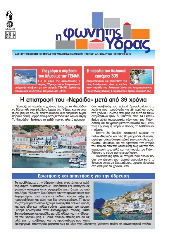 Διαβάστε μεταξύ άλλων: Υπεγράφη η σύμβαση του Δήμου Ύδρας με την ΤΕΜΑΚ (έργο Αφαλάτωσης), η παραλία του Αυλακιού εκπέμπει SOS, το περισκόπιο του μήνα, η υποδοχή του «Νεράιδα» και μια επίκαιρη συζήτηση με τον Αντιδήμαρχο Ύδρας Τάσο Σωτηρόπουλo.