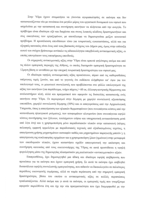 Με την παρούσα επιστολή επιθυμούμε να σας περιγράψουμε και να διαμαρτυρηθούμε για την πραγματικά ανυπόφορη για τους κατοίκους της Ύδρας κατάσταση, η οποία έχει δημιουργηθεί λόγω των υπερβολικά υψηλών αντικειμενικών αξιών στο Νησί.