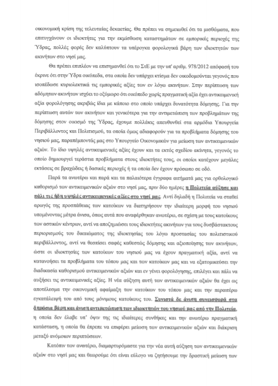 Παρά τα ανωτέρω και παρά και τα παλαιότερα έγγραφα αιτήματά μας για ορθολογικό καθορισμό των αντικειμενικών αξιών στο νησί μας, πριν δύο ημέρες η Πολιτεία αύξησε και πάλι τις ήδη υψηλές αντικειμενικές αξίες στο νησί μας. Αντί δηλαδή η Πολιτεία να σταθεί αρωγός της προσπάθειας των κατοίκων να διατηρήσουν την ιδιαίτερη μορφή του νησιού υπομένοντας μέτρα άνισα, όπως αυτά που αναφέρθηκαν ανωτέρω, σε σχέση με τους κατοίκους των αστικών κέντρων, αντί να αποζημιώσει τους ιδιοκτήτες ακινήτων για τους δυσβάστακτους περιορισμούς του δικαιώματος της ιδιοκτησίας του λόγω προστασίας του πολιτιστικού περιβάλλοντος, αντί να θεσπίσει σαφές καθεστώς δόμησης και αξιοποίησης των ακινήτων, ώστε οι ιδιοκτησίες των κατοίκων του νησιού μας να έχουν πραγματική αξία, αντί να κατανοήσει τα προβλήματα του τόπου μας και των κατοίκων μας και να εξατομικεύσει την διαδικασία καθορισμού αντικειμενικών αξιών και εν γένει φορολόγησης, επιλέγει και πάλι να αυξήσει τις αντικειμενικές αξίες. Η νέα αύξηση αυτή των αντικειμενικών αξιών θα έχει ως αποτέλεσμα την οικονομική αφαίμαξη των κατοίκων του τόπου μας και την περαιτέρω εγκατάλειψή του από τους μόνιμους κατοίκους του. Συνιστά δε άνιση συνεισφορά στα δημόσια βάρη και άνιση αντιμετώπιση των ιδιοκτητών του νησιού μας από την Πολιτεία, η οποία δεν έλαβε υπ’ όψιν της τις ιδιαίτερες συνθήκες και την ανωτέρω πραγματική κατάσταση, η οποία θα έπρεπε να επιφέρει μείωση των αντικειμενικών αξιών και διάκριση μεταξύ ανόμοιων περιπτώσεων.