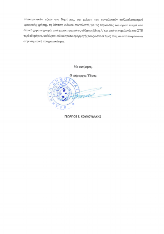 Ο Δήμαρχος κάνει λόγο στην επιστολή για τιμές ψηλότερες από πλέον εμπορικές τιμές στην Αθήνα τονίζοντας παράλληλα την υψηλή επιβάρυνση και στα ακίνητα εμπορικής χρήσης στην Ύδρα.