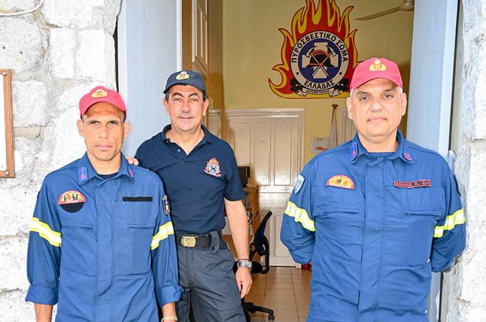 Στη φωτογραφία ο Προϊστάμενος του Εθελοντικού Πυροσβεστικού Κλιμακίου Ιωάννης Γκανατσούλης, ο Αναπληρωτής Προϊστάμενος Παύλος Κόκκος και ο Νίκος Πλευρίτης.