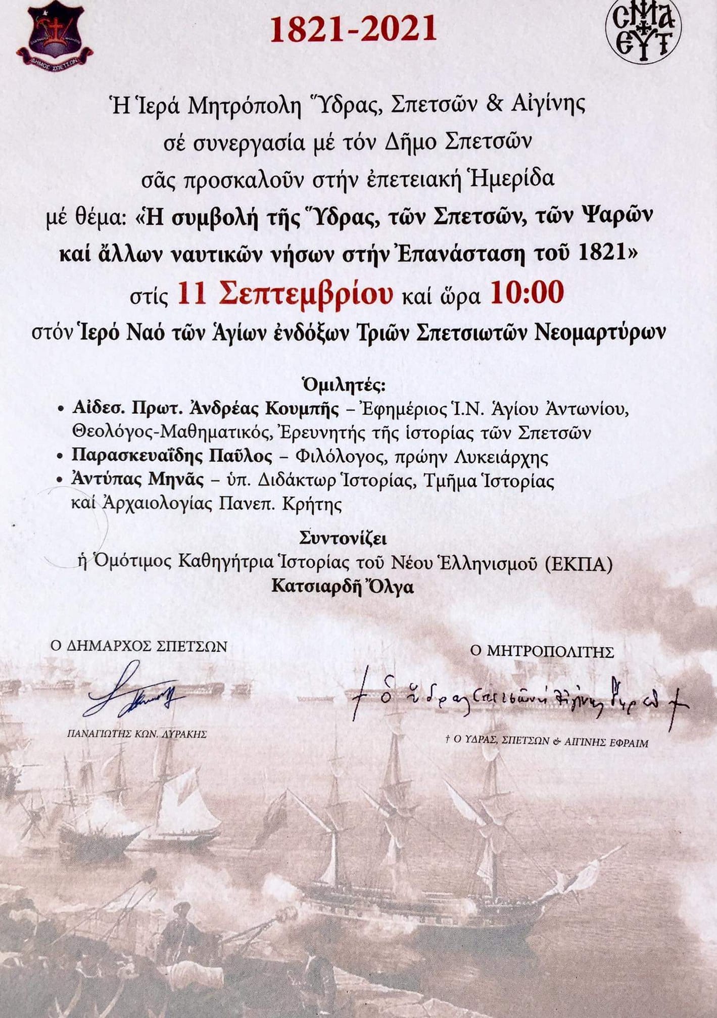 Η Ιερά Μητρόπολη Ύδρας, Σπετσών και Αιγίνης σε συνεργασία με τον Δήμο Σπετσών οργανώνουν το Σάββατο 11 Σεπτεμβρίου και ώρα 10:00, επετειακή Ημερίδα με θέμα: "Η συμβολή της Ύδρας, των Σπετσών, των Ψαρών και άλλων ναυτικών νήσων στην Επανάσταση του 1821".