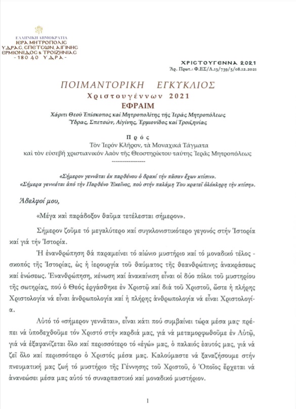 Η Ποιμαντορική Εγκύκλιος των Χριστουγέννων 2021 του Σεβ. Ποιμενάρχου, Μητροπολίτη Ύδρας, Σπετσών, Αιγίνης, Ερμιονίδας και Τροιζηνίας κ.κ. ΕΦΡΑΙΜ.