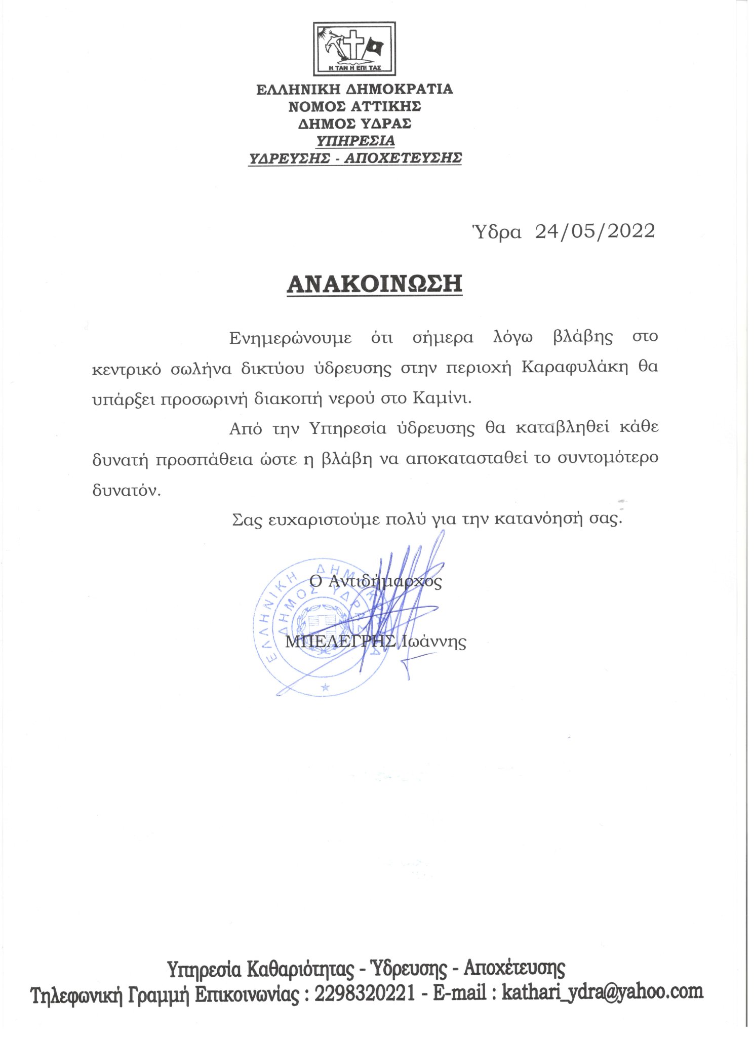 Προσωρινή διακοπή νερού θα υπάρξει σήμερα στην περιοχή Καραφυλάκη στο Καμίνι λόγω βλάβης στον κεντρικό σωλήνα.