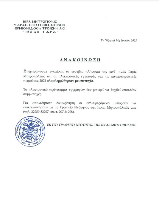 ΚΑΤΑΣΚΗΝΩΣΕΙΣ Ι. ΜΗΤΡΟΠΟΛΗΣ ΥΔΡΑΣ, ΣΠΕΤΣΩΝ ΚΑΙ ΑΙΓΙΝΗΣ - Ολοκληρώθηκαν οι ηλεκτρονικές εγγραφές