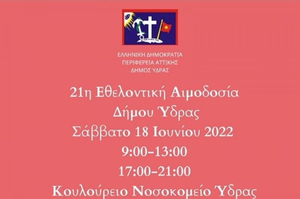 Η Αντιδήμαρχος Ύδρας Μαίρη Κάτσικα ευχαριστεί θερμά όλους τους εθελοντές αιμοδότες που τίμησαν με την παρουσία τους και όλους όσοι συνέδραμαν στην επιτυχή έκβαση της 21ης εθελοντικής αιμοδοσίας του Δήμου Ύδρας.