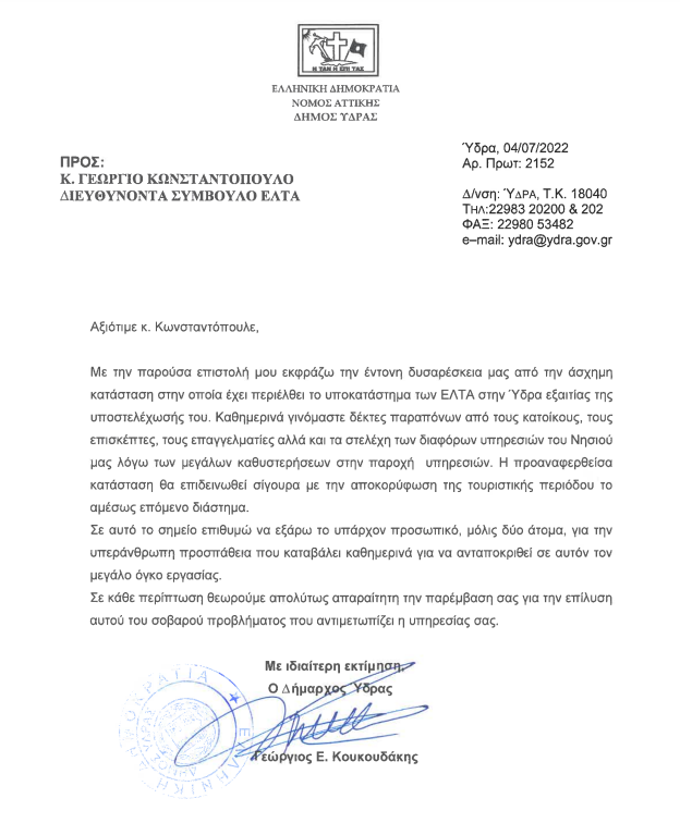 Επιστολή στον Διευθύνοντα Σύμβουλο των ΕΛΤΑ Γεώργιο Κωνσταντόπουλο απέστειλε ο Δήμαρχος Ύδρας Γιώργος Κουκουδάκης, εκφράζοντας την δυσαρέσκεια των φορέων, του εμπορικού κόσμου και των πολιτών από την άσχημη κατάσταση στην οποία έχουν περιέλθει τα ΕΛΤΑ της Ύδρας εξαιτίας της υποστελέχωσης.