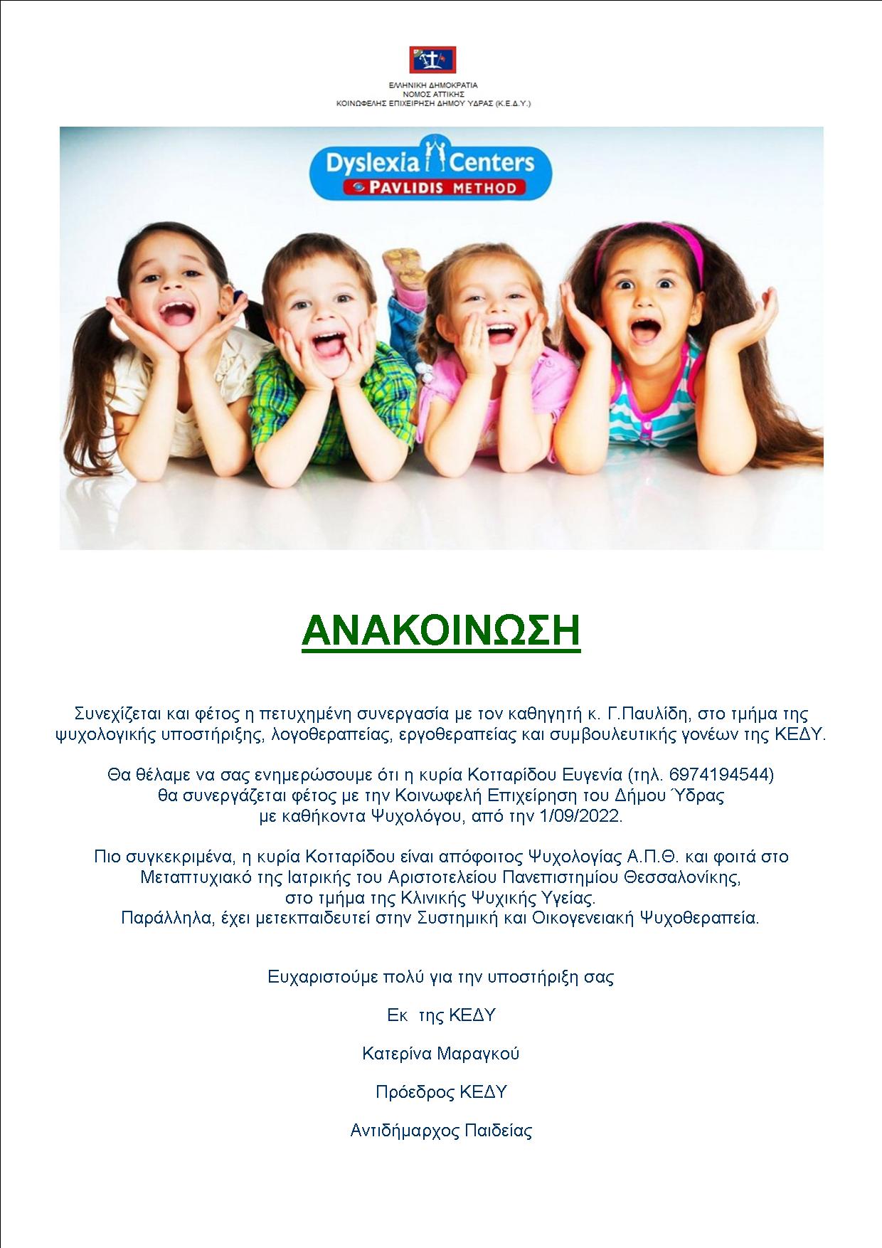 H Κοινωφελής Επιχείρηση του Δήμου Ύδρας ενημερώνει για τη συνέχιση της συνεργασίας με τον Καθηγητή Γ. Παυλίδη στο τμήμα της ψυχολογικής υποστήριξης κ.α.