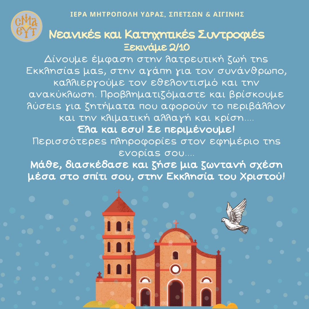 Ξεκινούν στις 2 Οκτωβρίου 2022 οι νεανικές και κατηχητικές συντροφιές της Ιεράς Μητρόπολης Ύδρας, Σπετσών και Αιγίνης.