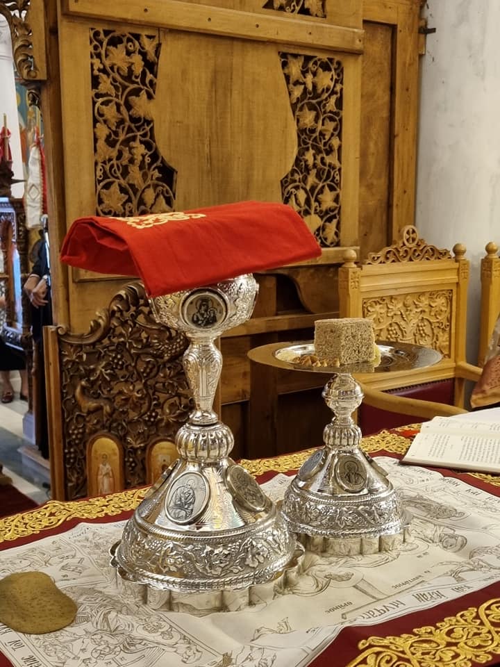 Ευλόγησε τα μήλα, και προ της απολύσεως ετέλεσε Αρχιερατικό μνημόσυνο του αοιδίμου Γέροντος Μητροπολίτου Ύδρας Κυρού ΙΕΡΟΘΕΟΥ, κτίτορος του Ι. Ναού του Αγίου Κωνσταντίνου.