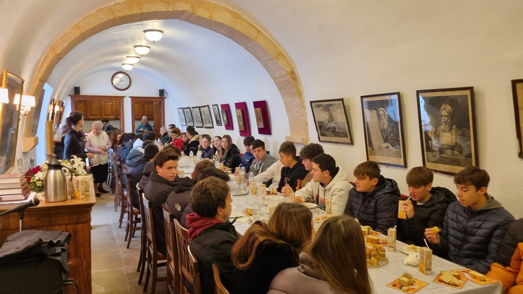Μετά το πέρας της Αρχιερατικής Θ. Λειτουργίας ο Σεβασμιώτατος παρέθεσε στην κυρία Διευθύντρια του Λυκείου Ύδρας , στους Καθηγητές και στα παιδιά δεξίωση, στην τραπεζαρία όπου έγινε και επίκαιρη συζήτηση.