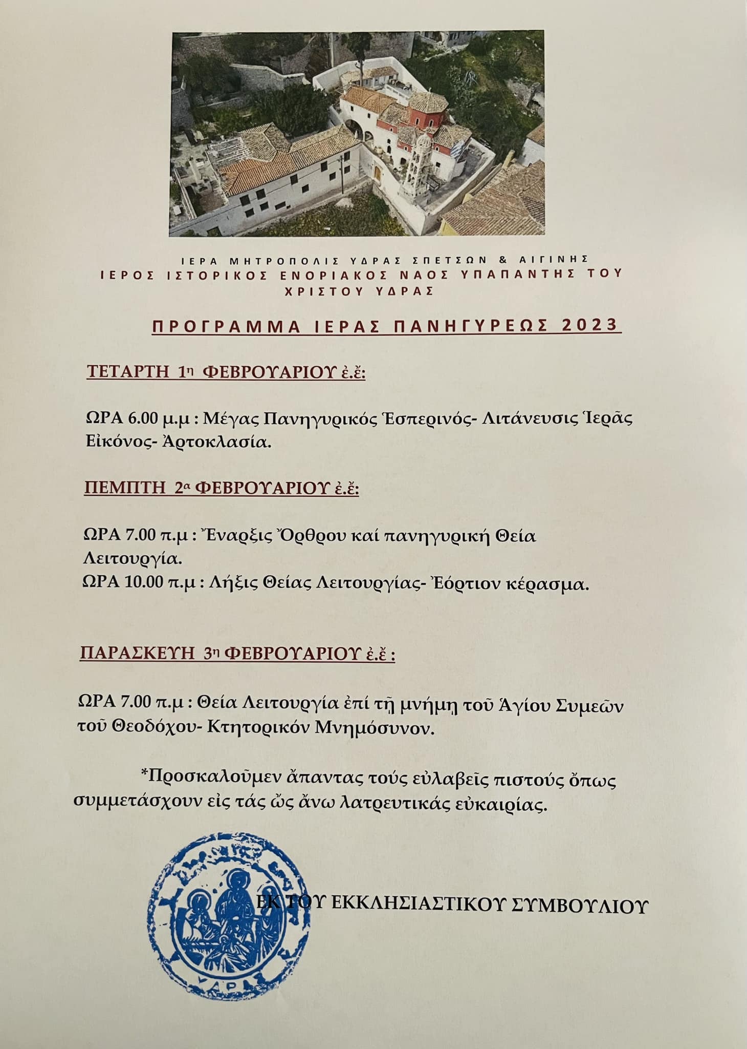 Ο Αρχιερατικός Επίτροπος και Εφημέριος του Ι. Ιστορικού Ναού Υπαπαντής του Χριστού Ύδρας, Πανοσιολογιότατος Αρχιμανδρίτης π. Θεόδωρος Θεοδοσίου προσκαλεί το εκκλησίασμα στην Ιερά Πανήγυρη: