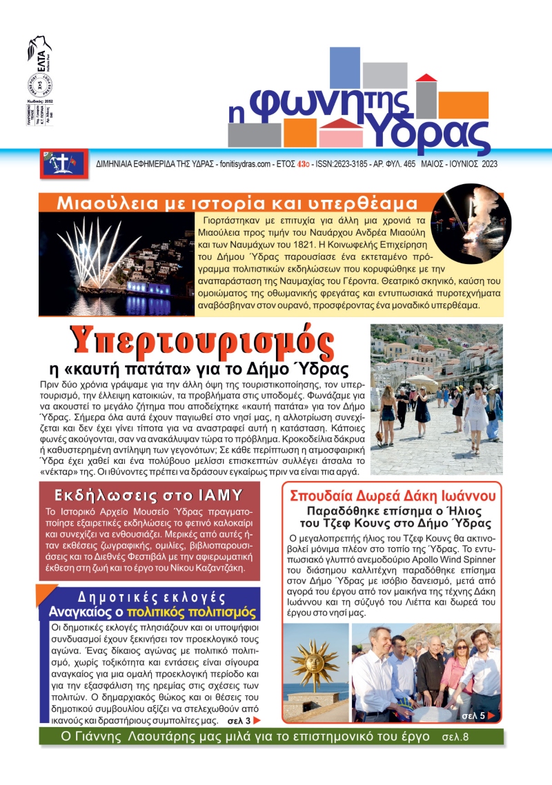 Κυκλοφόρησε το τεύχος (Αρ. Φύλ. 465) Μαΐου - Ιουνίου 2023, της "Φωνής της Ύδρας" με 16 σελίδες με όλα τα νέα του νησιού για το δίμηνο που πέρασε και ό,τι συμβαίνει γενικότερα, με καίρια άρθρα και επισημάνσεις.