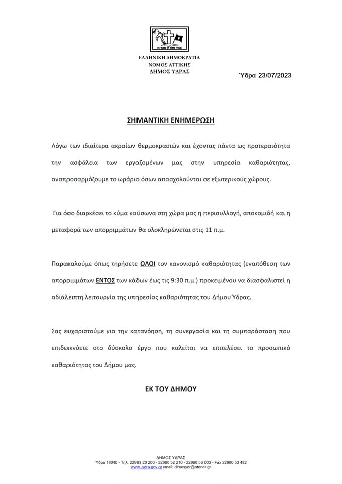Λόγω των ιδιαίτερα ακραίων θερμοκρασιών ο Δήμος Ύδρας και έχοντας πάντα ως προτεραιότητα την ασφάλεια των εργαζομένων στην υπηρεσία καθαριότητας, αναπροσαρμόζει το ωράριο όσων απασχολούνται σε εξωτερικούς χώρους.