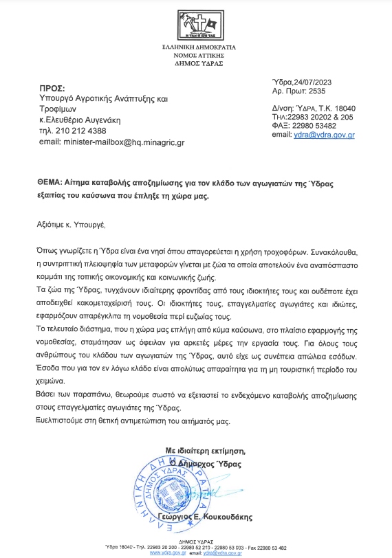 Επιστολή στον Υπουργό Αγροτικής Ανάπτυξης και Τροφίμων Ελευθέριο Αυγενάκη απέστειλε ο Δήμαρχος Ύδρας Γιώργος Κουκουδάκης, με αίτημα την καταβολή αποζημίωσης για τον κλάδο των αγωγιατών του νησιού εξαιτίας του καύσωνα που έπληξε την χώρα μας: