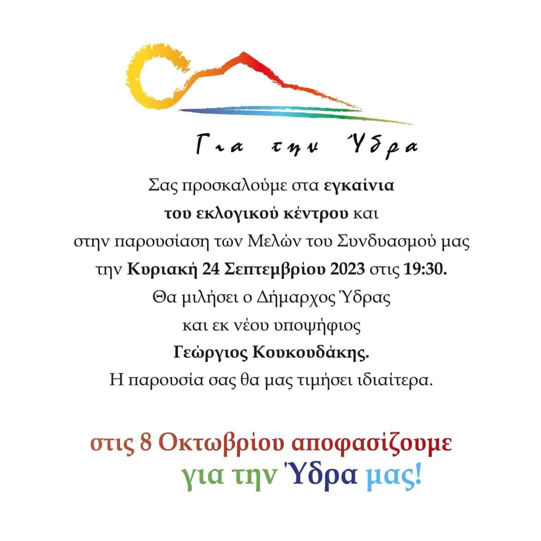 - Την Παρασκευή 6 Οκτωβρίου και ώρα 19:30 στο λιμάνι της Ύδρας θα πραγματοποιηθεί η κεντρική προεκλογική ομιλία του επικεφαλής του Συνδυασμού "Για την Ύδρα" Γιώργου Κουκουδάκη.